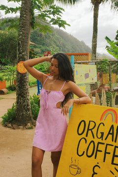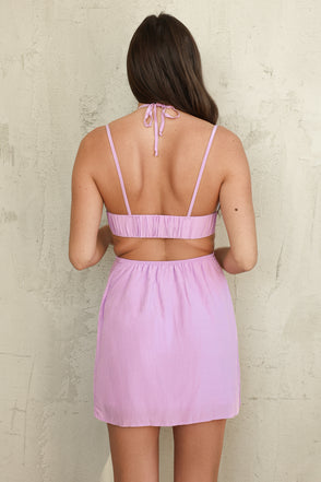 This season’s favorite mini dress. Our Gold Coast Dress features a flattering straight neckline that can be cinched in the center with adjustable ties. Also features cutouts on each side to reveal a gorgeous open back.