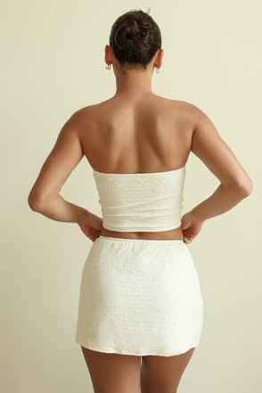 A feminine, bandeau-style tankini top featuring a mini bow accent at the center. Pairs perfectly with our matching Charmed Skirt.