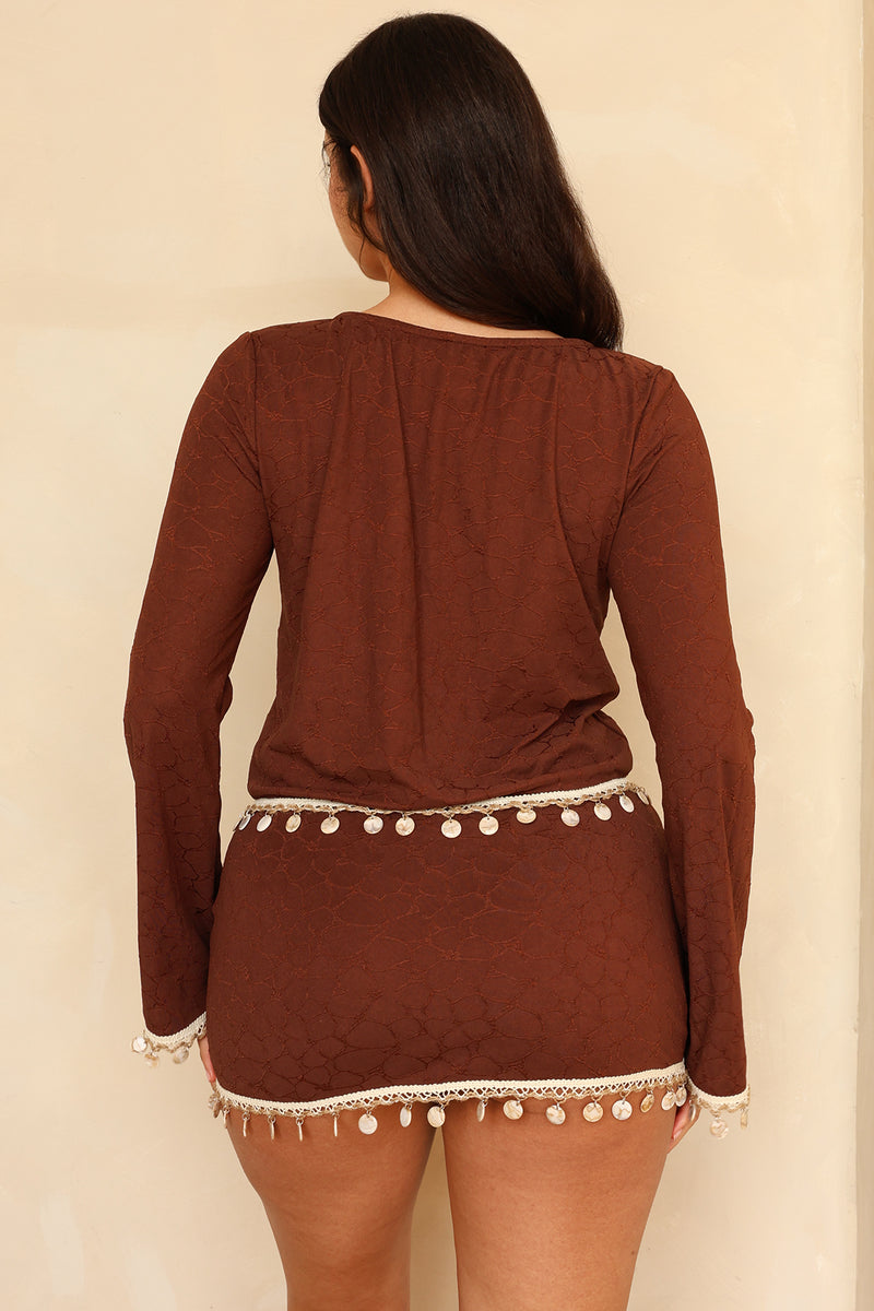 Our new breathable cover-up top featuring an open front and bead detailing on each sleeve. Designed to match our Firecracker Mini Skirt in Cappuccino.