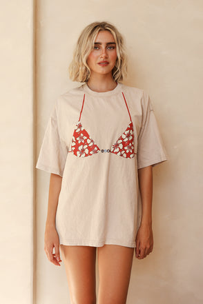 I love the idea of this shirt, but it was poorly executed. The straps are pixelated, the bikini print is too low, and the color of the shirt is like a tan brown color that is not flattering. Definitely not worth it for the price