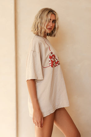 The base shirt is good quality and perfectly oversized. The graphic however is strangely placed and pixelated in some places. The graphic also cuts off strangely and has weird wavy edges. The color of the shirt is a darker stone color in person.