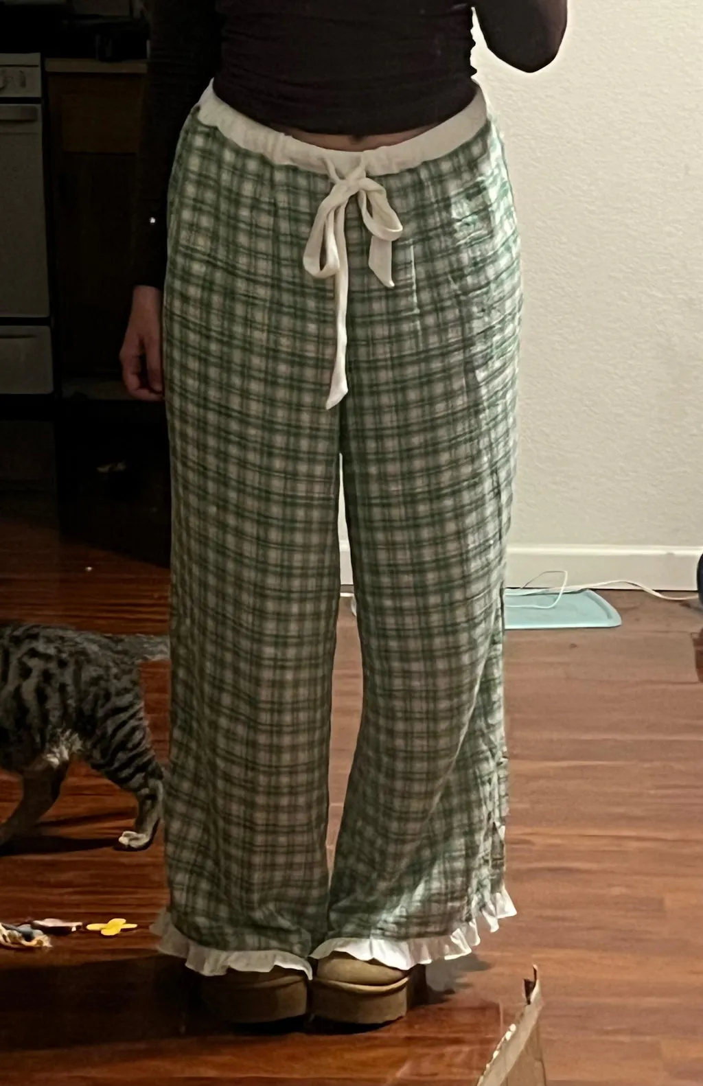 Very cute pants, the material is soft and comfortable. The reason for 4 stars is the pants are not as pictured on the waistband. The pants I received have a white thick waistband and the elastic inside of it is twisted in on itself. It’s not a huge deal but definitely worth knowing before buying.