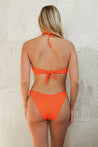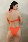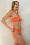 A bandeau-style bikini top with straps connected at the center and tied in the back. Coco features a fun hardware accent in the middle. Designed to match our Caicos Bottom in Vibrant Orange.