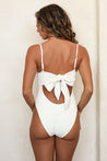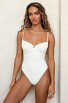 A twist on the classic one piece. With an underwire silhouette and moderate coverage, this suit will keep you supported and will fit like a dream. This one piece is designed with adjustable straps and a tie back closure.