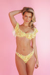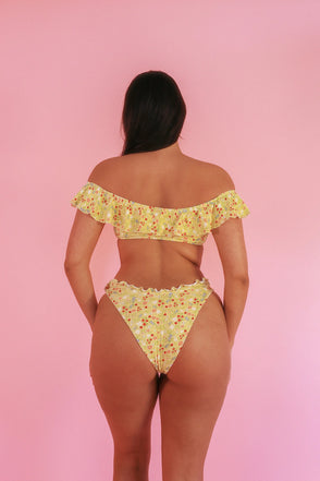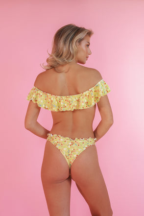 A girly, ruffled off-the-shoulder bikini top designed with a flattering scrunch detail at the front. Pairs well with our matching Byron Bottom.