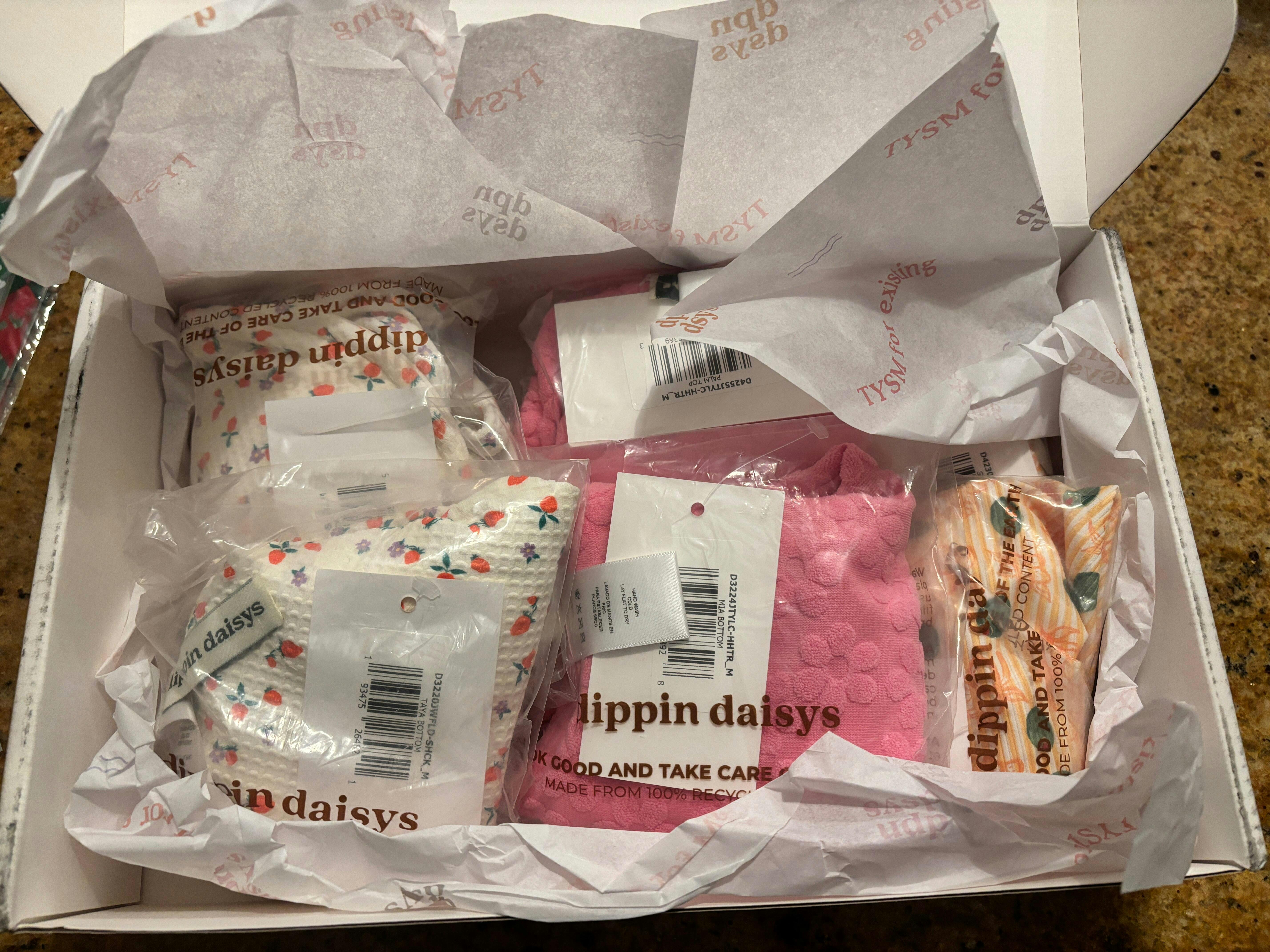 Our Mystery Gift Box is the perfect way to refresh your swimwear collection with 3 complete bikini sets hand-selected just for you. Each box is carefully curated to bring you a mix of styles, colors, and patterns from our stunning Dippin' Daisy's collection.