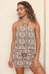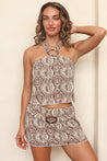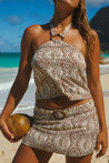Our halter top features a stunning wooden ring detail at the front and center with straps that tie in a cute bow at the back. Pair with our new Salsa Skirt for a matching set.