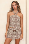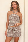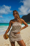 Our new mini skirt features a mock belt with a wooden ring detail at the center. Pairs perfectly with our new Dune Top.