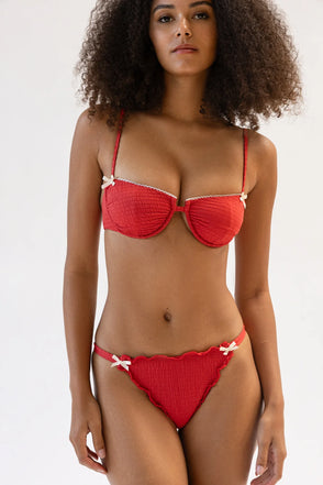 A new underwire bra-style bikini top featuring thin straps, mini bow details and a delicate ruffled trim at the top. Pair Ines with our Luisa Bottom or Lucca Bottom for a matching set.