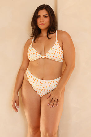 The Clementine Triangle Cheeky Set features a sleek triangle top and cheeky bottom in bold clementine—made for boardwalk days, shimmering waves, and effortless allure.