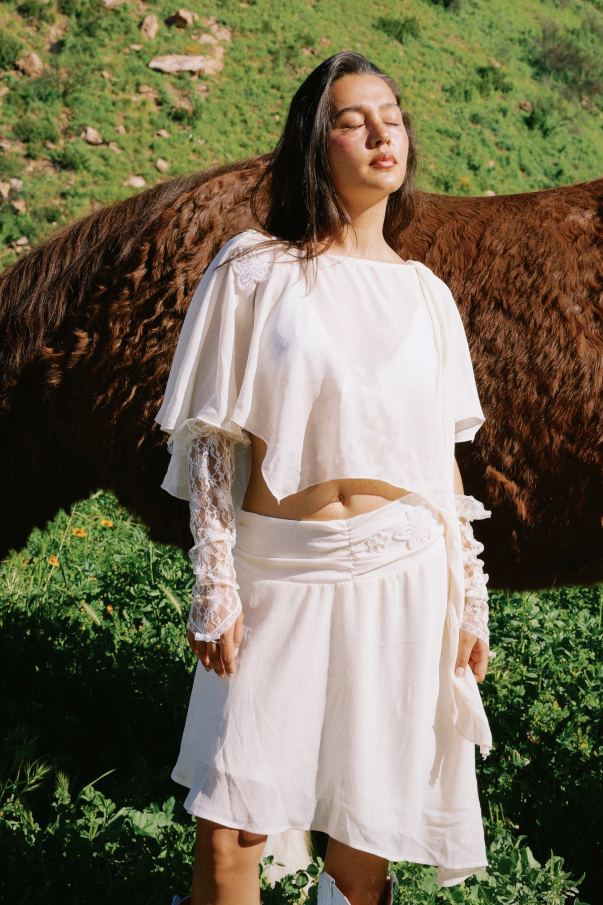 Our new poncho-style top made in a breathable, sheer fabric with beaded embroidery on one shoulder. Pairs best with our matching Sunbeam Skirt.