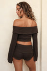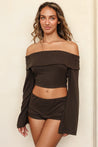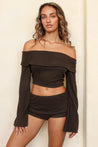Our new cropped sweater top features an off-the-shoulder neckline and flattering, flowy sleeves. Pairs best with our matching new Fold Over Mini Shorts.