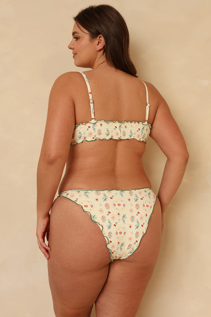 A feminine twist on a sporty silhouette. The Bonita Top features gorgeous ruffled edges, thin straps and a sweet mini bow at the center. Pair Bonita with our matching June Bottom.