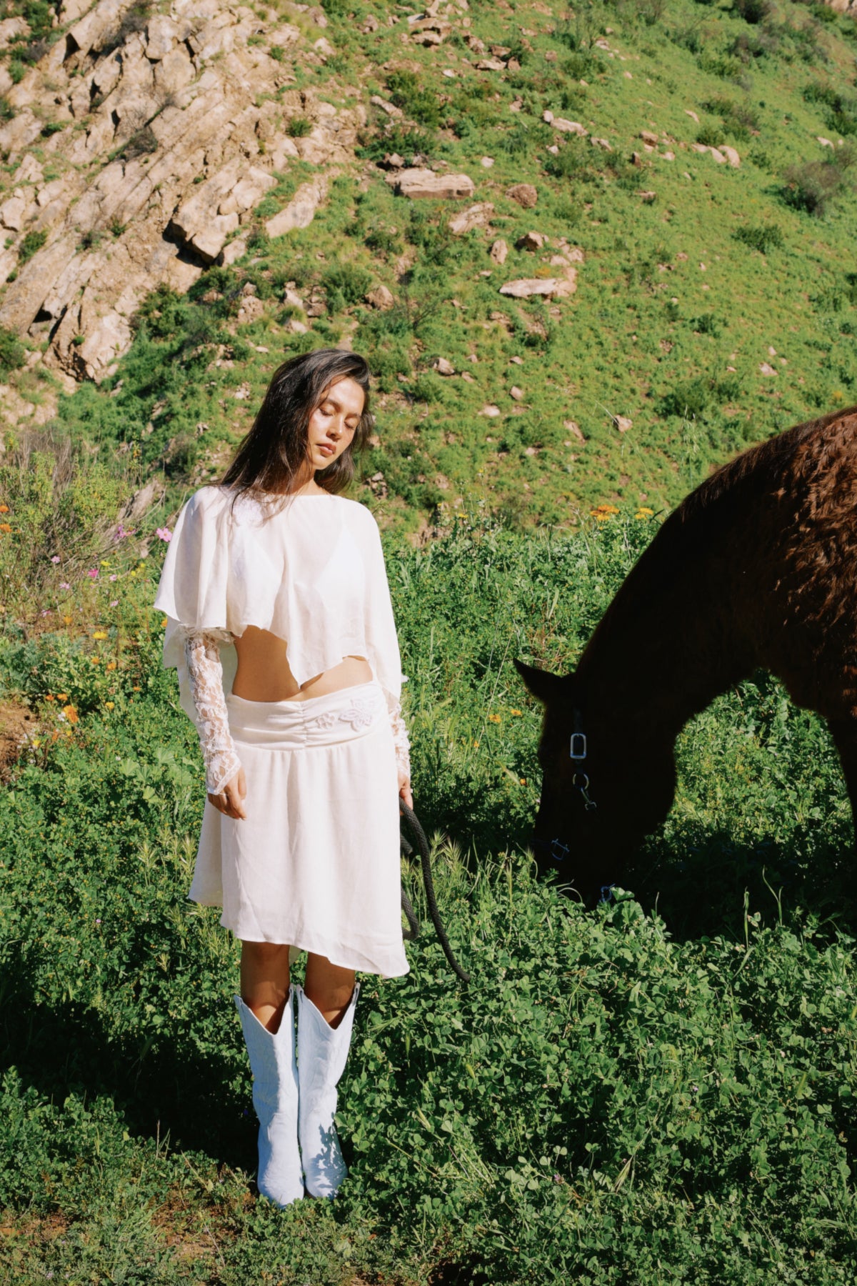 A low-waisted skirt with a thick waistband, asymmetrical bottom hem and flower embroidery to match back with our Borrowed Bliss Top.