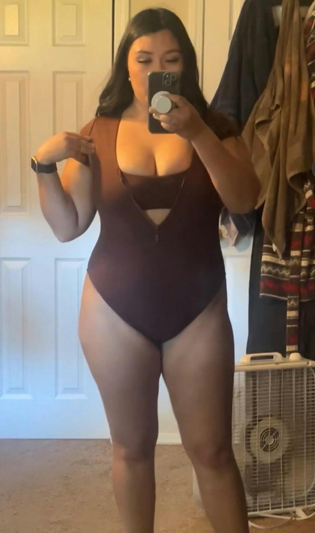 It has a flattering high-cut fit, front zipper detail, and Neoprene fabric.