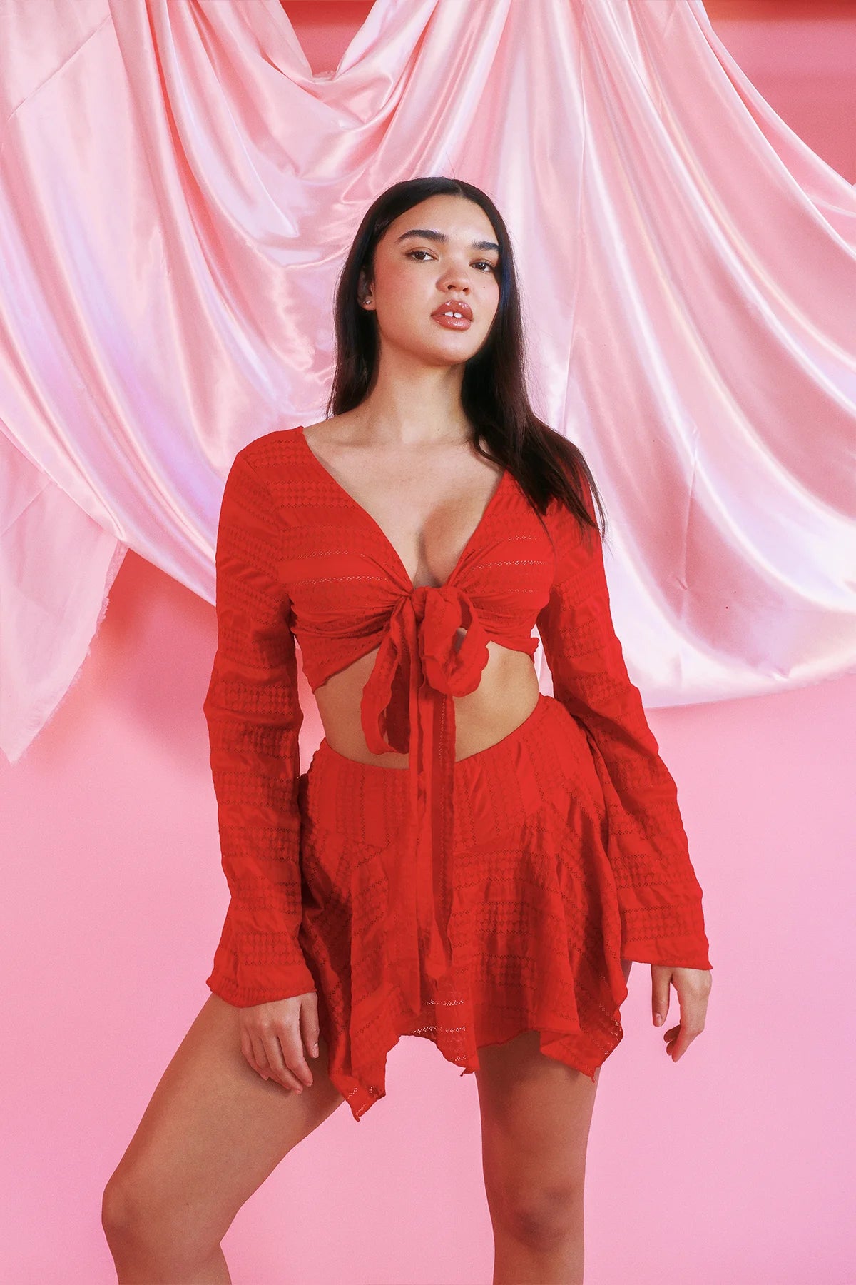 A long-sleeve, cropped tie top with ruffled sleeves designed in a gorgeous red lace-y fabric. Pairs perfectly with our Trullo Miniskirt.