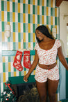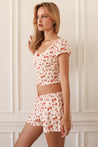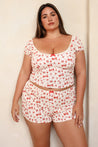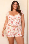Our new lounge top features cozy capped sleeves, a mini bow detail at the front and center and a flattering scoop neckline with lace trim.