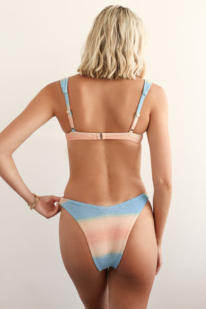 Our underwire bralette bikini top that’ll lift you up in all the right places. Barbados features thick straps and ruched fabric on the bust. Designed to match our Tahiti Bottom in Lumi—a subtle orange and yellow ombré.
