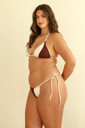 A classic scrunch bikini bottom with colorblocking down the middle. Featuring adjustable ties on each side. Pairs perfectly with our Ava Top.