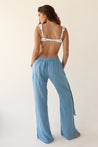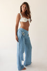 Our new wide-leg pants feature an asymmetrical sash that ties at one hip, secured by a gold buckle. The perfect cover-up for any bikinis from our Greek Islands collection.