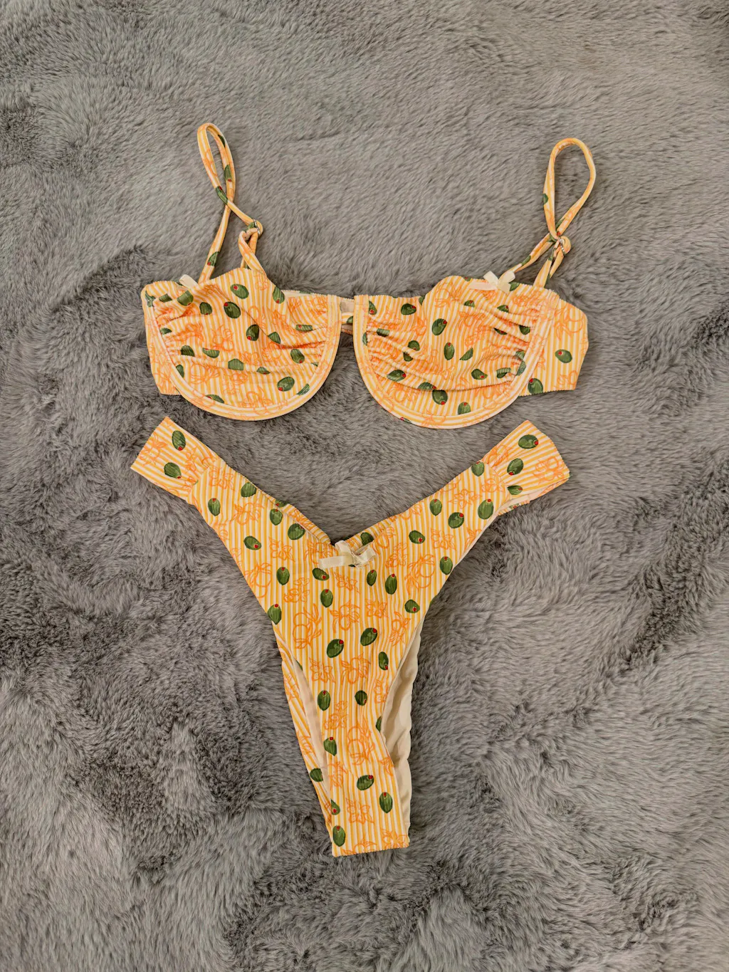 Super flattering shape and nice thick material. Back is more cheeky than thong. True to size and print is so cute.