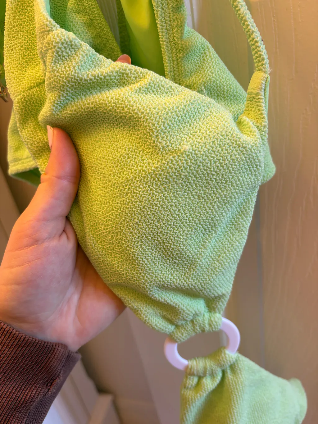 A playful take on the classic triangle bikini top, double straps and scrunched detailing.